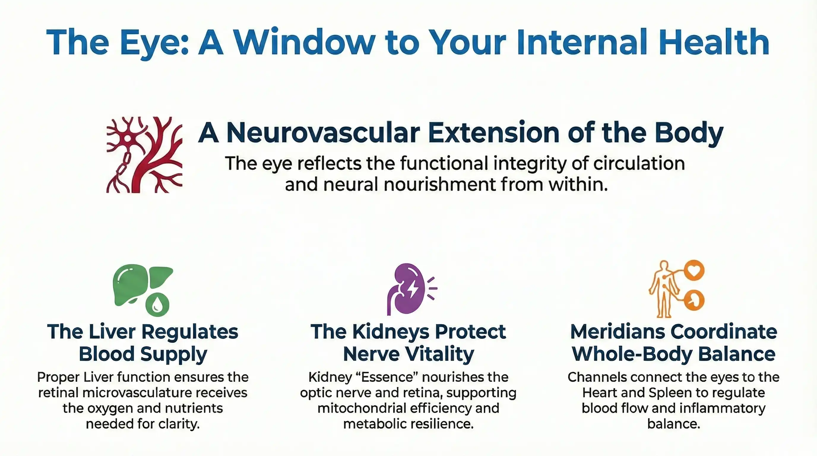In Traditional Chinese Medicine (TCM), the eye is understood not as an isolated sensory organ but as a neurovascular extension of the body’s internal organs. Vision reflects the functional integrity of organ systems, circulation, and neural nourishment, making the eye a visible endpoint of deeper physiological processes. This concept closely parallels modern views of the retina and optic nerve as highly specialized neural tissue dependent on precise vascular regulation.