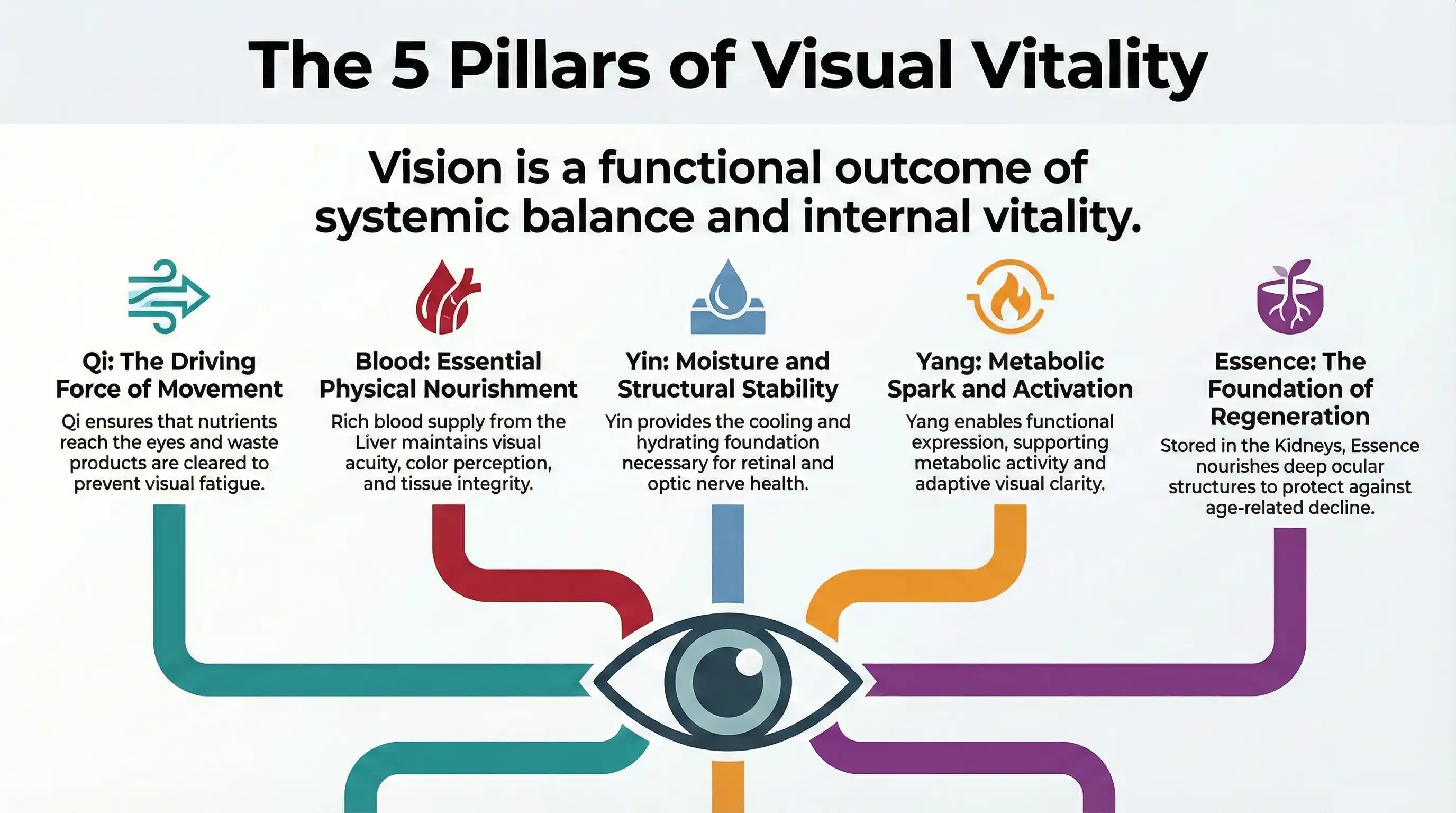 In Traditional Chinese Medicine (TCM), visual physiology is understood through the dynamic interplay of Qi, Blood, Yin, Yang, and Essence (Jing).These foundational concepts describe how the eyes are nourished, regulated, and sustained over time. Rather than focusing solely on anatomy, TCM explains vision as a functional outcome of systemic balance and internal vitality.