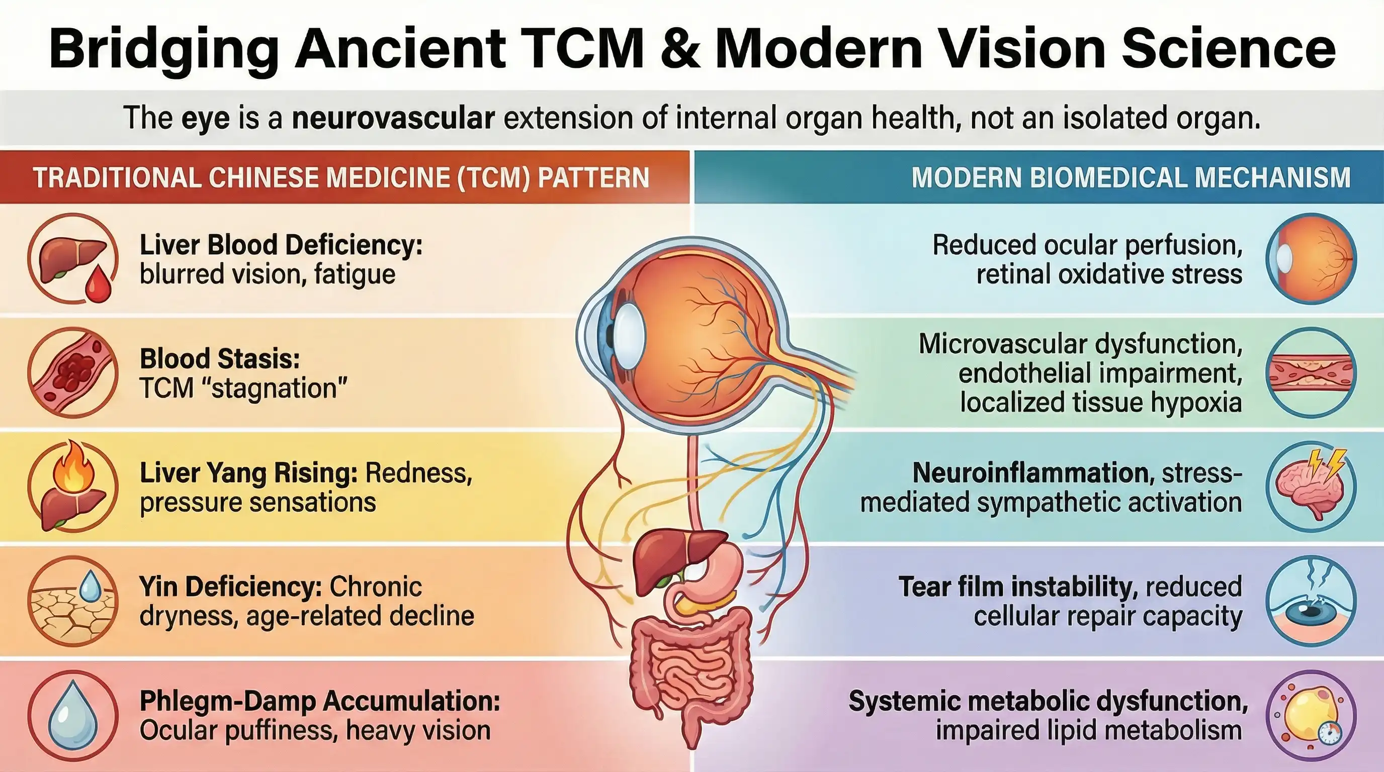 Traditional Chinese Medicine (TCM) classifies eye disorders according to functional patterns rather than isolated anatomical diagnoses. These patterns reflect underlying systemic imbalances that influence ocular nourishment, circulation, inflammation, and neural integrity. When viewed through a modern biomedical lens, many of these classical patterns closely parallel recognized mechanisms in vision science, offering a meaningful bridge between traditional observation and contemporary physiology.