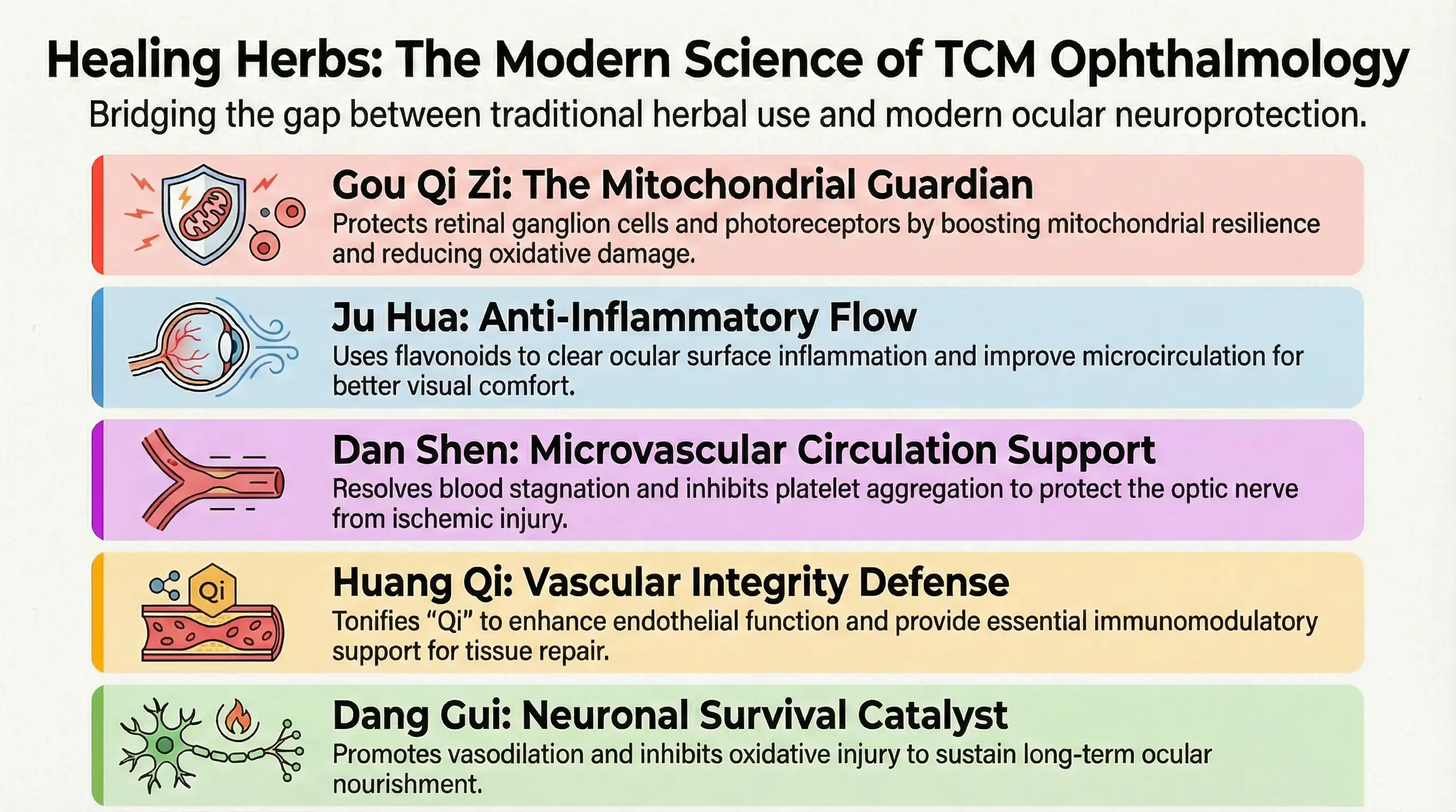 Traditional Chinese Medicine (TCM) has long employed medicinal herbs to support vision by restoring systemic balance and nourishing ocular tissues. Modern research has begun to clarify how many of these herbs exert measurable biological effects that align with contemporary understandings of ocular pathology, including oxidative stress, vascular dysregulation, inflammation and neuro-degeneration. Together, classical theory and modern science offer a complementary framework for understanding herbal mechanisms in eye health.